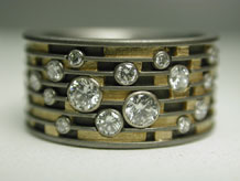 Titanium (7)channel band with random inlays of 24K gold, with (2)3mm, (7)2.5mm, (14)2mm, and (23)1.5mm diamonds, all set in 18K gold - approx. 10mm wide Slavi's ring. |